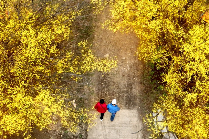 노란 산수유 꽃으로 뒤덮이며
